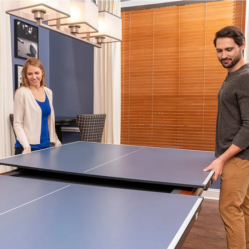 The JOOLA Billiard Table Tennis Conversion Top converts your billiard pool table into a performance table tennis table with a metal apron included. This is the best-selling table from Joola without the undercarriage. This is a regulation size conversion top that functions in two separate halves for easy setup and storage. Multiply your game room and save space by adding two games in one.